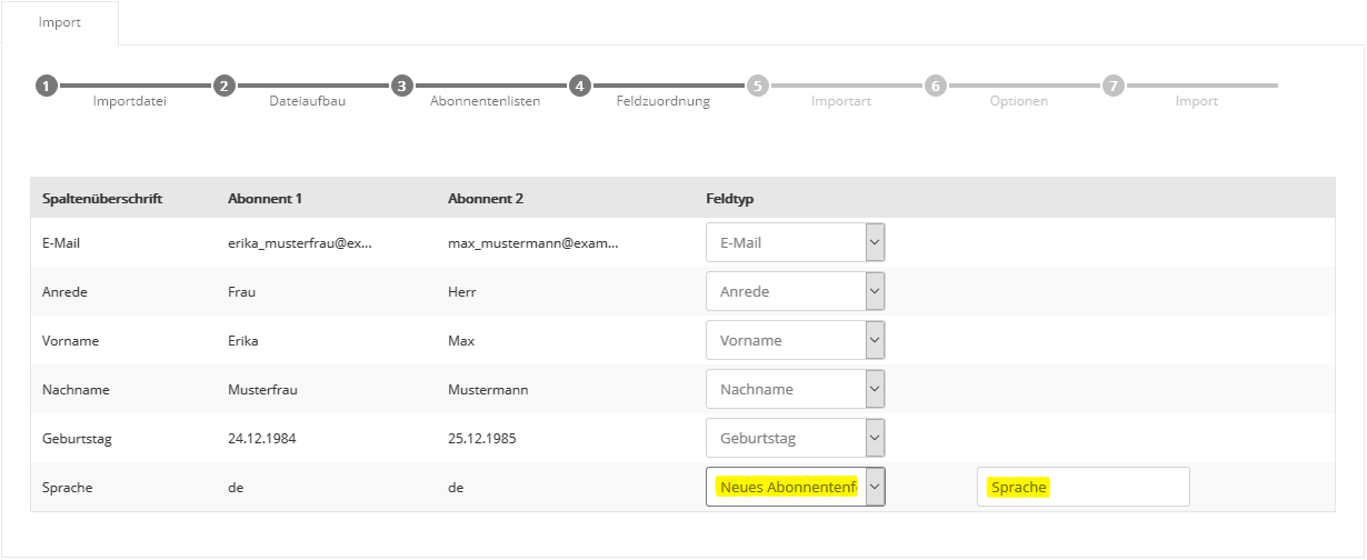 Auch die Auswahl mehrerer Abonnentenlisten ist möglich, falls Sie parallel in mehrere Listen importieren möchten. Klicken Sie nach Auswahl der gewünschten Liste(n) auf 'Übernehmen' und anschließend auf 'Weiter'. Der Name einer Abonnentenliste lässt sich im Menü Abonnentenlisten auch nachträglich jederzeit ändern. Schritt 4 - FeldzuordnungIn Schritt 4 teilen Sie pmailer mit, welche Spalte (z.B. Vorname, Nachname) Ihrer CSV-Datei in welches pmailer Abonnentenfeld importiert werden soll. Zum schnellen Einstieg sind typische Abonnentenfelder wie 'E-Mail', 'Anrede', 'Vorname' und 'Nachname' in pmailer bereits vorhanden.