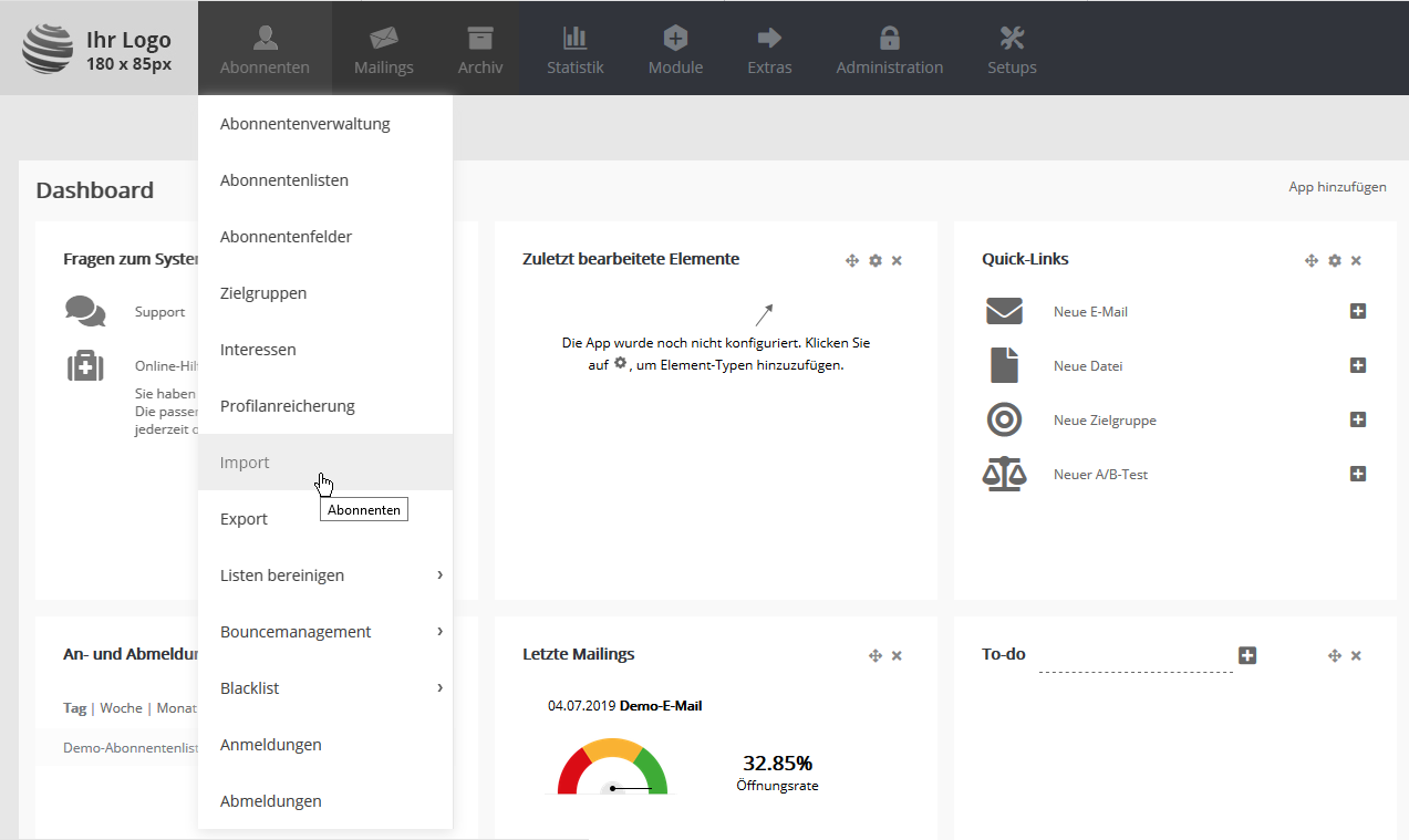 Zum Abspeichern Ihrer Daten wählen Sie bitte je nach Version Ihres Office-Paketes das Exportformat CSV UTF8 (Trennzeichen-getrennt) oder CSV (Trennzeichen-getrennt). Import Schritt für Schritt erklärtUm Ihre CSV-Datei in pmailer zu importieren, wählen Sie im Menü 'Abonnenten' den Punkt 'Import':