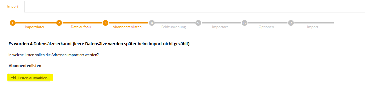 Schritt 3 - AbonnentenlistenWählen Sie nun aus, in welche pmailer Abonnentenliste ihre CSV-Datei importiert werden soll. Falls Sie zuvor keine eigene Abonnentenliste in pmailer angelegt haben (siehe Menü Abonnentenlisten), steht zum schnellen Einstieg die leere Abonnentenliste 'Demo-Liste' bereit. Diese Liste wird in der Regel bei der Einrichtung Ihres pmailer Kontos angelegt und zur Demonstration mit einem Beispiel-Abonnenten befüllt.