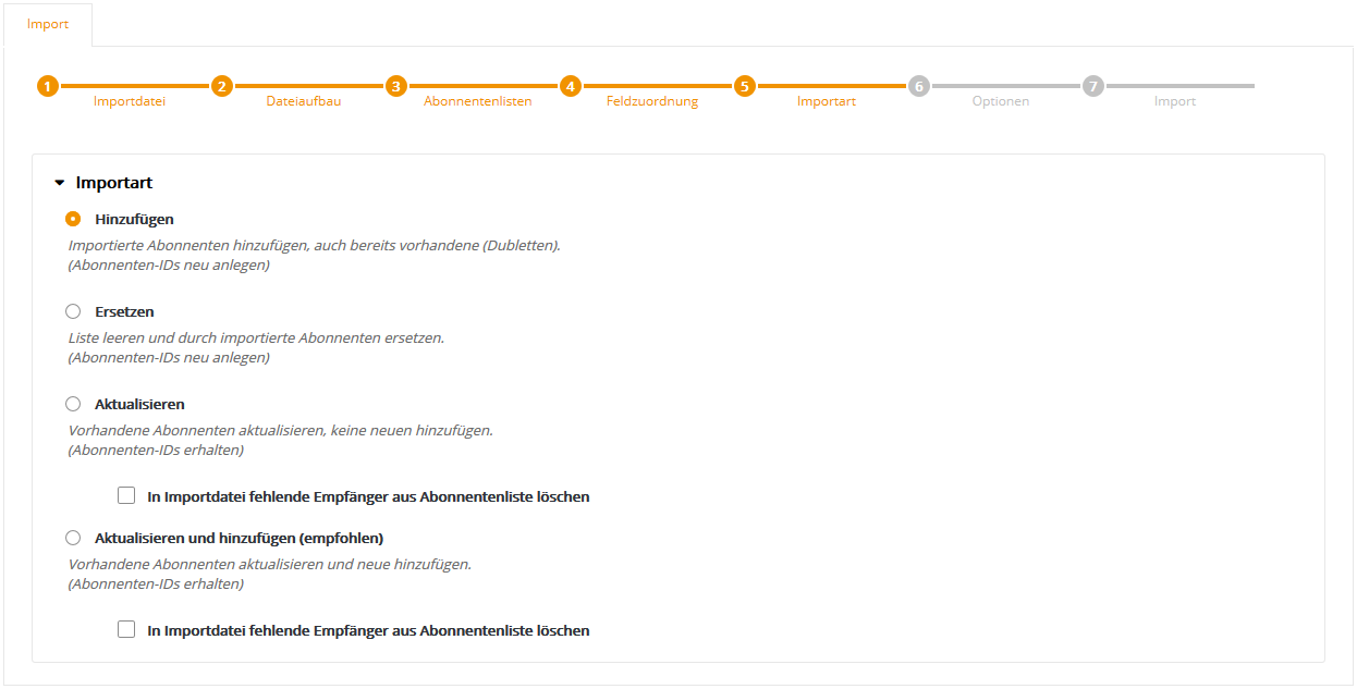 Auf der linken Seite sehen Sie am Beispiel der ersten beiden Abonnenten noch einmal den Inhalt Ihrer CSV-Datei. Auf der rechten Seite wählen Sie bitte den 'Feldtyp', der zum jeweiligen Inhalt passt. Dabei übernimmt pmailer die Zuordnung automatisch, wenn der Name von CSV-Spaltenüberschrift und pmailer-Abonnentenfeld übereinstimmt. Wird automatisch kein passendes Abonnentenfeld gefunden, ist der neue Feldinhalt zunächst auf 'nicht importieren' gesetzt. Wählen Sie in dem Fall entweder eines der vorhandenen Felder aus, oder nutzen Sie die Option 'neues Abonnentenfeld', um ein neues Feld anzulegen und ihm einen Namen zu geben. An dieser Stelle erhalten neue Felder grundsätzlich den Typ 'mehrzeiliger Text', siehe auch nachfolgender Tipp. Klicken Sie anschließend auf 'Weiter'. --> Tipp: Idealerweise sollten Sie sich bereits vor dem Import einmalig die Zeit nehmen, im pmailer Menü 'Abonnentenfelder' alle Felder so anzulegen, dass Feldname und Feldtyp zu Ihren importierten Daten passen. Damit profitieren Sie zukünftig von der automatischen Feld-Zuordnung, was bei wiederkehrenden Importen nicht nur Zeit spart, sondern auch eventuelle Fehler durch unpassende Feldtypen oder die manuelle Feld-Zuordnung verhindert. Schritt 5 - ImportartHier legen Sie fest, wie Ihre neu importierten Daten mit den vorhandenen 'alten' Daten der gewählten pmailer-Abonnentenliste(n) abgeglichen werden sollen.