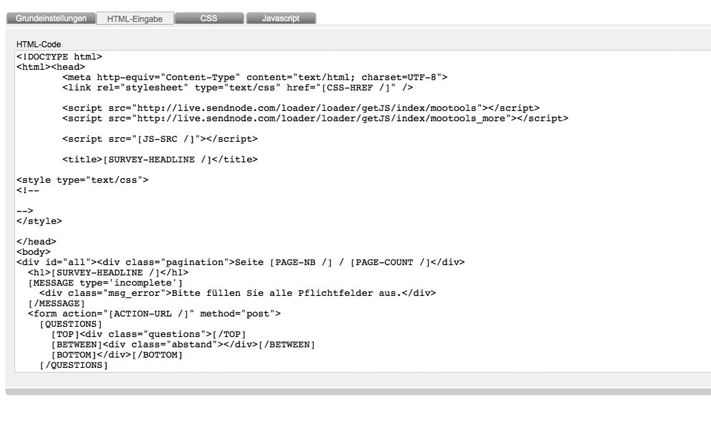 Insert your entire html source code. By creating a new template, pmailer generates a sample html source code with all important survey-placeholders automatically in this tab.