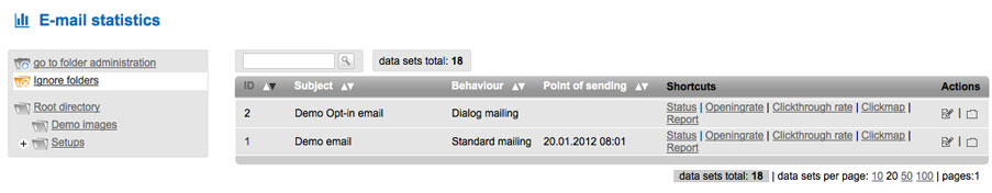 Here you find the statistics of all sent mails. For easier access pmailer already includes a demo-mail you can view. |