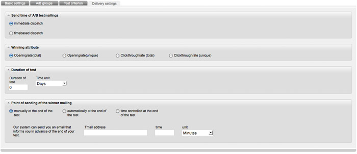 In the last tab you define the settings for the dispatch. Determine by which criterion (opening-rate or click-through-rate) pmailer should identify the winner. Equally important is to determine the duration of the test.
