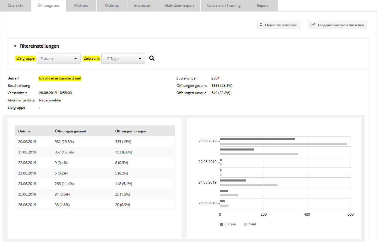 Filtereinstellungen für StandardmailsVoreingestellt ist ein Zeitraum von 10 Tagen ab Versandstart. Alle angezeigten Werte beziehen sich auf den gewählten Filter von Zielgruppe und Zeitraum. Deshalb können sie je nach gewähltem Filter deutlich geringer sein, als die ungefilterten Gesamtwerte des Reiters 'Übersicht'. Der folgende Screenshot zeigt die gefilterten Öffnungsdaten von Abonnenten der Zielgruppe "Frauen" im Zeitraum von 7 Tagen ab Versandstart.