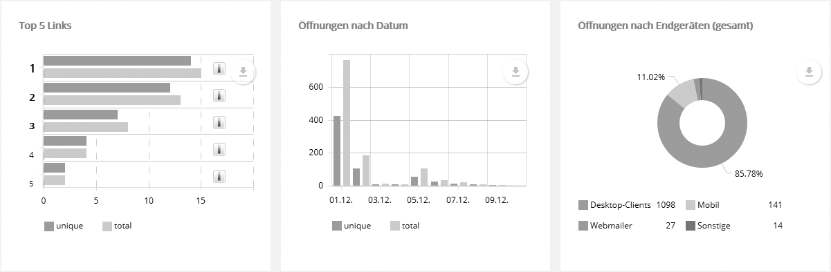 Per Klick auf 'Vollbild' wird die Karte im gesamten Fenster dargestellt. Direkt unter dem Vollbild-Link können Sie per Download-Button die Grafik der Karte in verschiedenen Formaten herunterladen. Hinweis: Obwohl IP-Adressen grundsätzlich nicht an einen bestimmten Ort gebunden sind, lässt sich durch die bekannten IP Adressräume von Internetprovidern, Universitäten und ähnlichen Einrichtungen in vielen Fällen der Standort ermitteln. Da regionale Einwahlknoten häufig einen festen IP-Adresspool besitzen, funktioniert das Verfahren auch bei dynamischer IP-Vergabe. Für die Zuordnung nutzt pmailer eine regelmäßig aktualisierte lokale Kopie einer Geotargeting-Datenbank, die ein externer Dienstleister zur Verfügung stellt. --> Top 5 Links + Öffnungen nach Datum und EndgerätenWie bei jedem anderen Diagramm lassen sich auch hier per Download-Button (rechte obere Ecke) die angezeigten Daten als Grafik- oder Excel-Datei herunterladen. Einzelne Diagramm-Segmente lassen sich ein- oder ausblenden, indem man auf den entsprechenden Punkt in der Legende klickt, z.B. auf 'Desktop-Clients' im Diagramm 'Öffnungen nach Endgeräten'. Damit werden die übrigen Segmente auf 360° gezoomt und deren Prozentzahlen passen sich der neuen Anordnung an. So lässt sich das Verhältnis beliebiger Segmente direkt vergleichen.