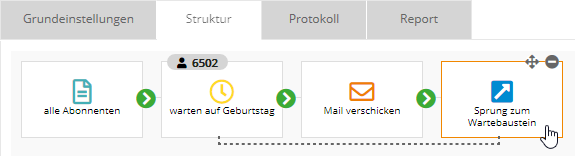 Den 'Sprungbaustein' verbinden Sie mit dem Wartebaustein. Damit springt der Abonnent nach Versand der Geburtstags-Mail zurück an den Anfang der Kampagne, um jedes Jahr erneut auf das passende Datum seines Geburtstages zu warten.