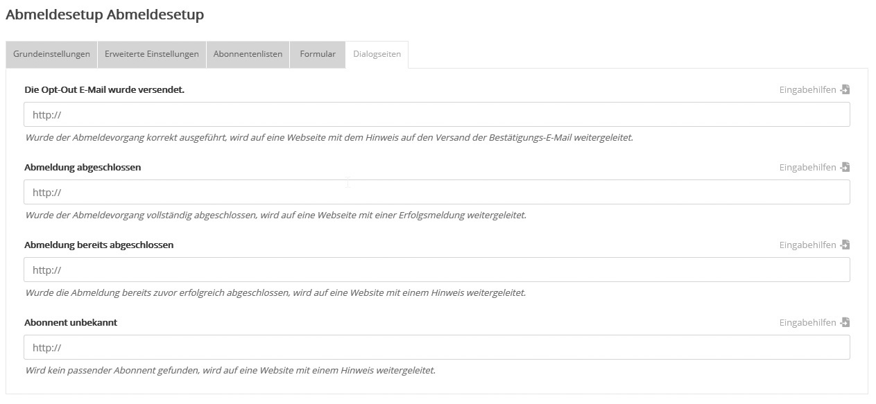 AbonnentenlistenJe nachdem, ob die Abmeldung per Newsletter-Link oder per Website-Formular stattfindet, wird der Abonnent aus folgenden Listen abgemeldet: Variante 1: Abmeldelink im NewsletterFür Standardmails gilt: Zusätzlich zu den auf dem Reiter 'Abonnentenlisten' gewählten Listen findet die Abmeldung auch in den angeschriebenen Listen statt. Für Kampagnen- und Dialogmails gilt dieser Zusatz nicht, da diese nicht an eine bestimmte Liste verschickt werden. Variante 2: Abmeldeformular auf WebsiteDie Abmeldung findet in den unter 'Abonnentenlisten' markierten Listen statt, und wenn vorhanden, dann auch in den direkt im Formular zur Auswahl durch den Nutzer angebotenen Listen (siehe nächster Abschnitt 'Formular'). Beides gleichzeitig ist nicht möglich. Das heißt: Sobald Sie eine Liste im Reiter 'Abonnentenlisten' markiert haben (und damit fest vorgeben), kann sie nicht gleichzeitig im Abmelde-Formular (ab)wählbar sein. Im dem Fall wird sie automatisch aus dem Formular entfernt und umgekehrt. Sonderfall beim Abmeldeformular: Ist keine Liste zur Abmeldung markiert und auch im Formular keine enthalten, dann findet die Abmeldung in allen Listen statt. Damit wird der Abonnent auch aus der 'Abonnentenverwaltung' entfernt. FormularHier erstellt pmailer automatisch den Quellcode für ein Abmeldeformular, das Sie auf Ihrer Website einbinden können. Den Inhalt des Formulars stellen Sie per Drag&Drop zusammen. Die Bedienung ist identisch zum Anmeldeformular-Editor. Nach Klick auf den Button 'Test des Formulars' wird Ihr neues Abmeldeformular angezeigt und die Funktion lässt sich anhand realer Abmeldungen testen. Geben Sie gültige und ungültige Abonnentendaten ein, um die entsprechenden Textmeldungen bzw. Dialogseiten zu prüfen. Ein während des Tests abgemeldeter Abonnent lässt sich unter 'Abonnenten' -> 'Abmeldungen' wiederherstellen. --> Hinweis zu Abmeldungen beim Testversand: Solange es sich um den Testversand eines Mailings handelt, findet bei Klick auf den Abmeldelink keine Abmeldung statt. Stattdessen wird lediglich eine Bestätigung angezeigt, ob das Abmeldesetup korrekt eingerichtet wurde. Erst beim späteren realen Versand findet eine tatsächliche Abmeldung statt und es erscheint die von Ihnen eingestellte Dialogseite, die Sie unter 'Formular testen' jederzeit testen können. Dialogseiten |